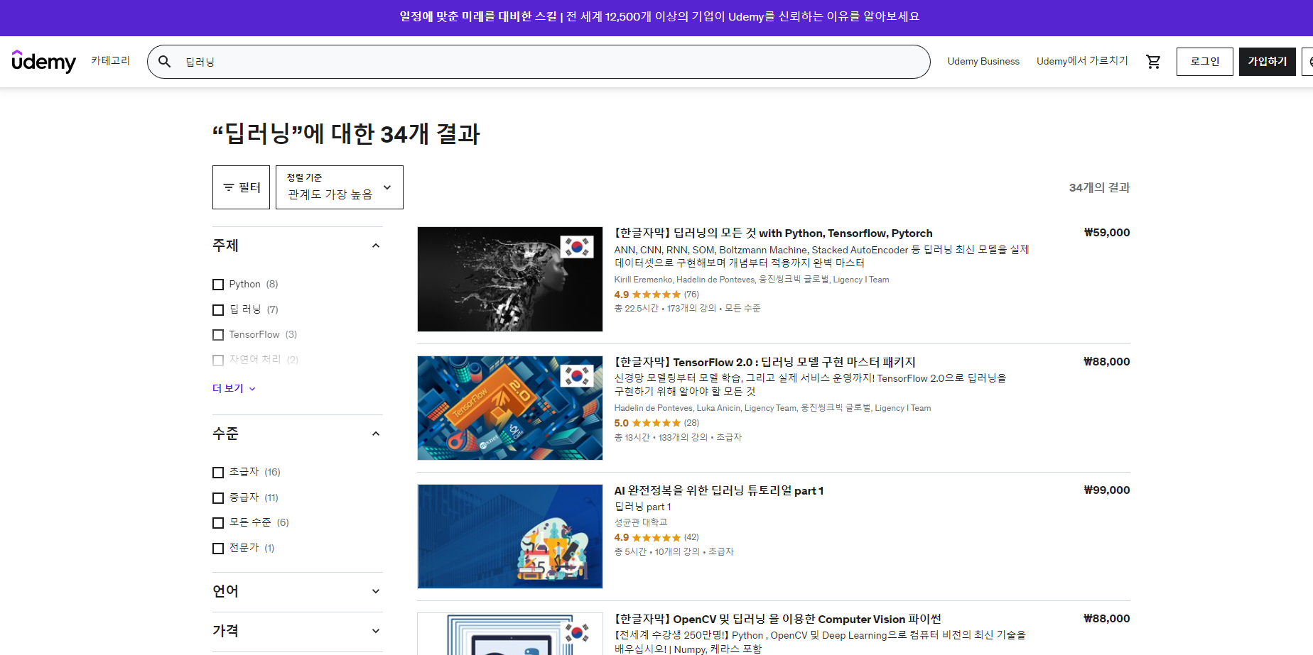실제 Udemy사이트에서는 34개가 검색되었었는데, 22개인걸 보면 다 나오진 않고 일부 선별되어 지원되는 것으로 예상됩니다.
