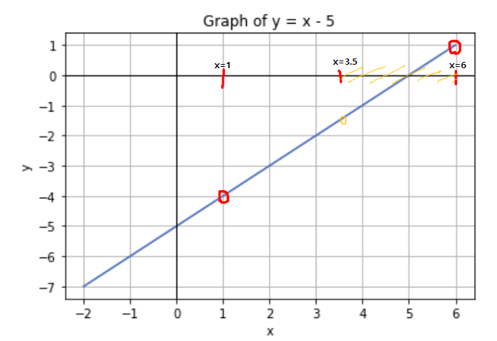 x=6을 대입해봅시다: f(6)=6−5=1. =>양수
